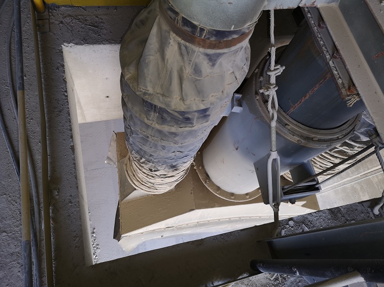 平臺下方結(jié)構(gòu):耐溫85°耐磨伸縮外布袋Φ600和內(nèi)布袋內(nèi)Φ300、散裝頭總成。鋼制散裝頭呈倒錐外型,其外側(cè)包有厚橡膠皮,可起到與灰罐車裝灰圓口的密封作用。