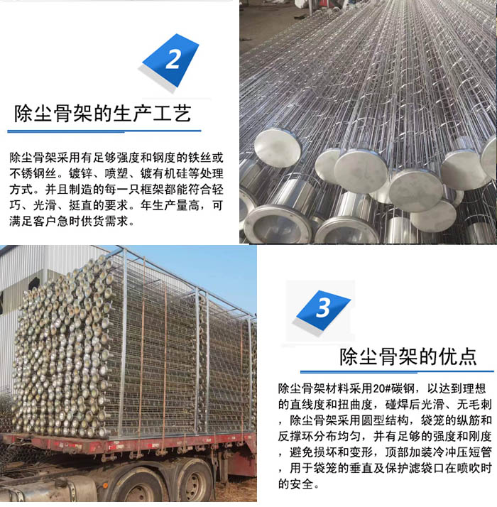 除塵骨架要求支撐環和縱筋分布均勻,并應有足夠的強度和剛度,能承受濾袋在過濾及清灰狀態中的氣體壓力,能防止在正常運輸和安裝過程中發生的碰撞和沖擊所造成的損壞和變形.